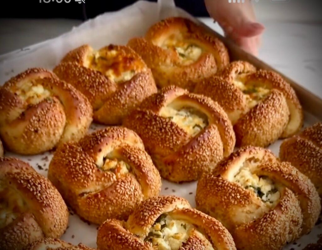 Când aluatul și-a dublat volumul, acesta se împarte în 16 bucăți egale. Fiecare bilă se lasă să se odihnească, acoperită, timp de 10 minute. Bucățile se întind apoi în pătrate de aproximativ 15×15 cm, se trec prin amestecul de apă cu zahăr, se presară cu susan și se umplu cu brânză, cașcaval și pătrunjel. Aluatul se modelează sub forma trandafirului și se lasă să mai crească 10–15 minute.