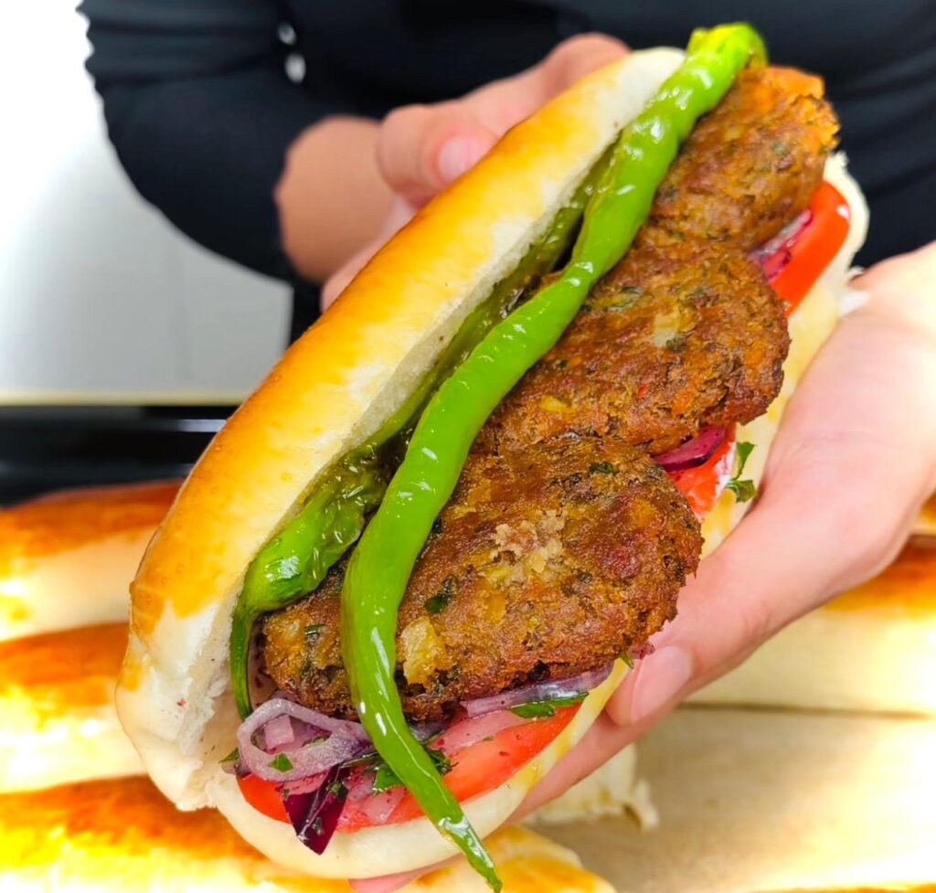 În final, fiecare pâinică se taie longitudinal și se umple cu chiftele, salată de ceapă și pătrunjel, roșii și ardei proaspeți, plus un strop de iaurt cu mentă.