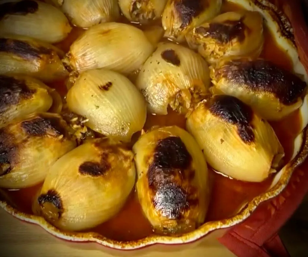 Separat se pregătește sosul din vin, pastă de roșii, sare, concentrat de rodie, ulei și apă fierbinte, care se toarnă uniform peste ceapa umplută. Tava se acoperă și se introduce în cuptorul preîncălzit la 180 de grade pentru aproximativ patruzeci de minute, timp în care ceapa devine moale și dulce, umplutura rămâne suculentă, iar sosul capătă o aromă intensă, perfectă pentru a fi savurată alături de pâine proaspătă.