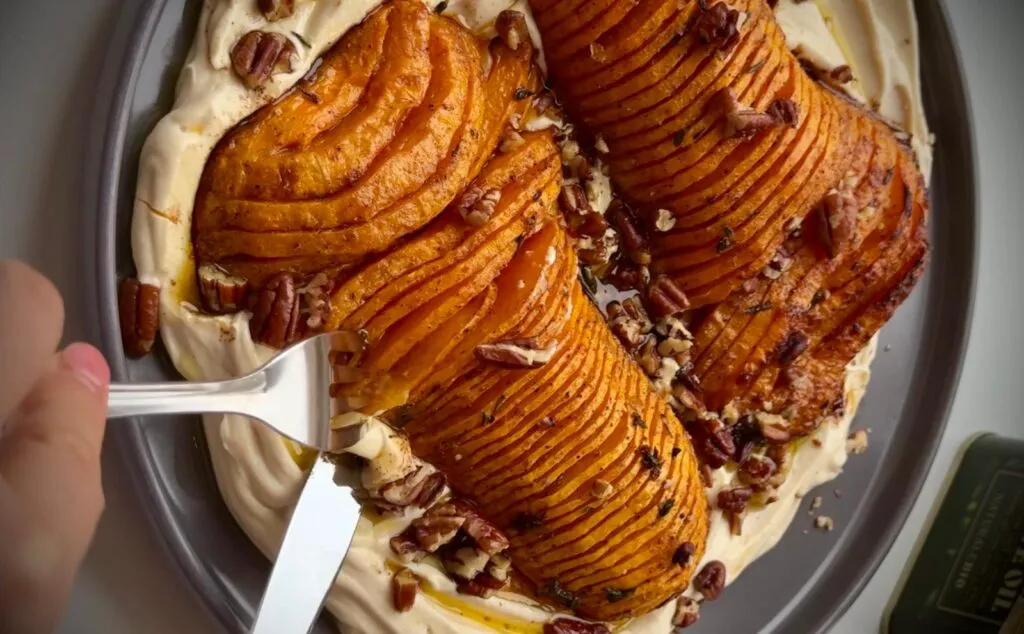 Dovleacul se taie în jumătate, se curăță de coajă și semințe, apoi se introduce la cuptor, la 180°C, pentru 10 – 12 minute, cât să se înmoaie ușor. După acest pas, se așază pe un tocător și se taie în stil hasselback, ca o armonică, folosind linguri de lemn sau bețișoare, pentru a nu ajunge cu cuțitul până la bază.