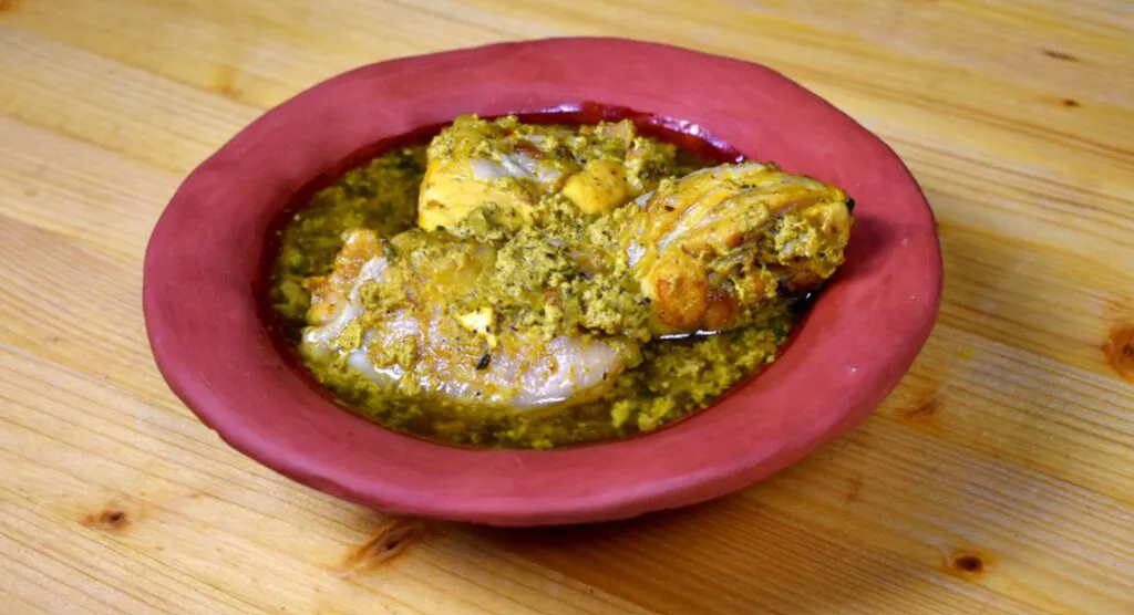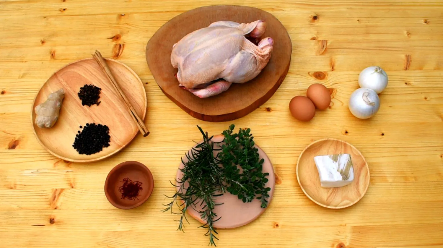 Tăiați puiul în bucăți, tocați slănina sărată și feliați ceapa. Topiți slănina și căliți ceapa până se înmoaie, apoi adăugați puiul. Prăjiți carnea câteva minute, apoi adăugați apă și fierbeți circa o oră. Pisați în mojar piper negru, scorțișoară și cuișoare, apoi adăugați șofranul.