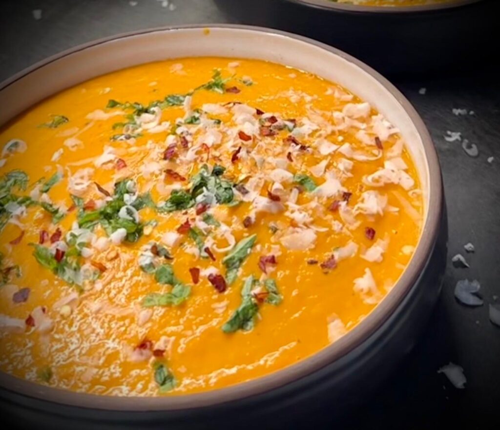 Servește supa caldă, decorată cu parmezan proaspăt ras, frunze de busuioc, un strop de lămâie și semințe prăjite pentru textură. Este reconfortantă, hrănitoare și plină de arome vibrante cae ajută, în plus, și la frumusețe.