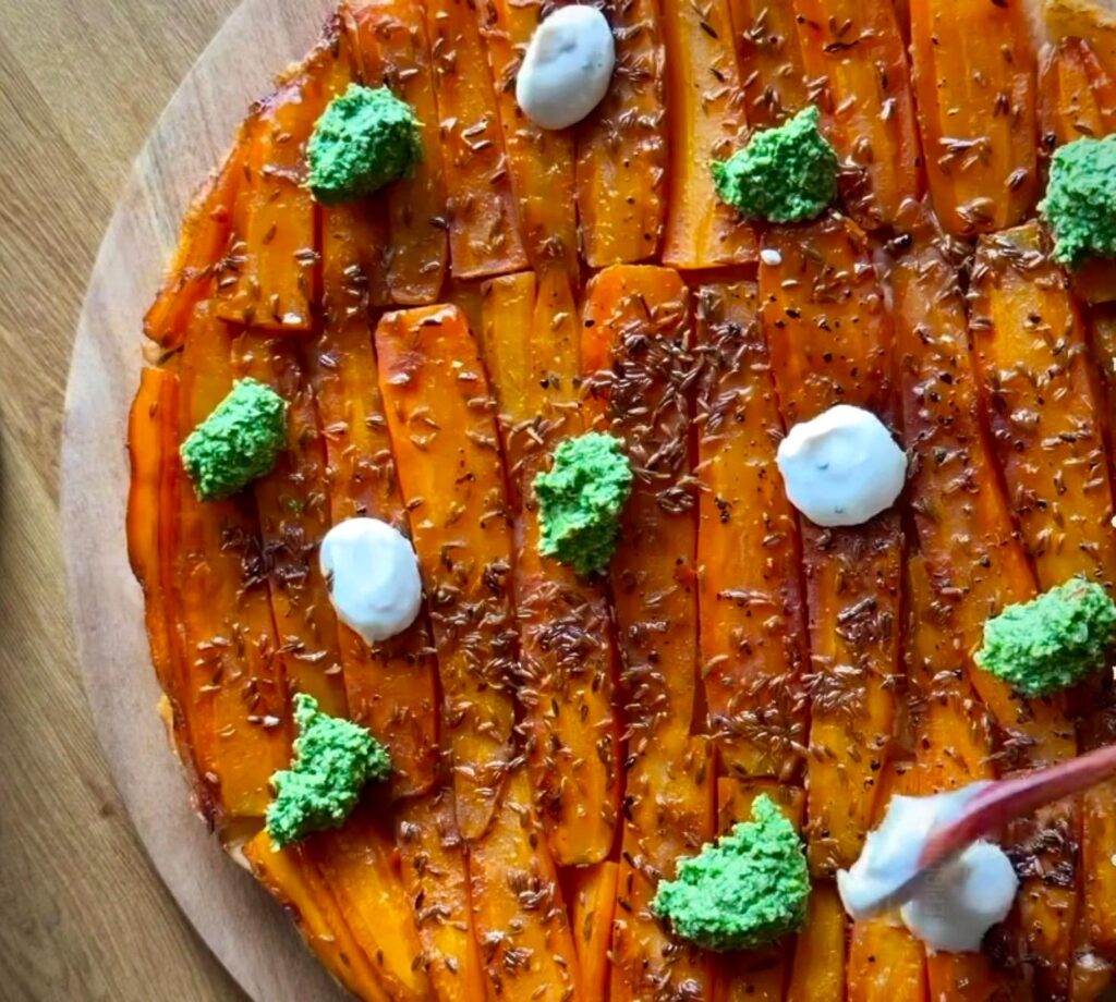 După coacere, tarta se răstoarnă cu grijă pe un platou, se adaugă pesto-ul din frunze de morcovi, sosul de iaurt cu tahini și, opțional, câteva ierburi proaspete pentru decor.