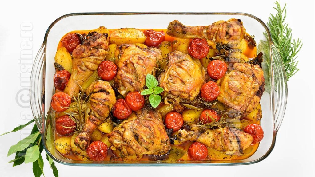Varză la cuptor cu cartofi și copănele de pui aromate