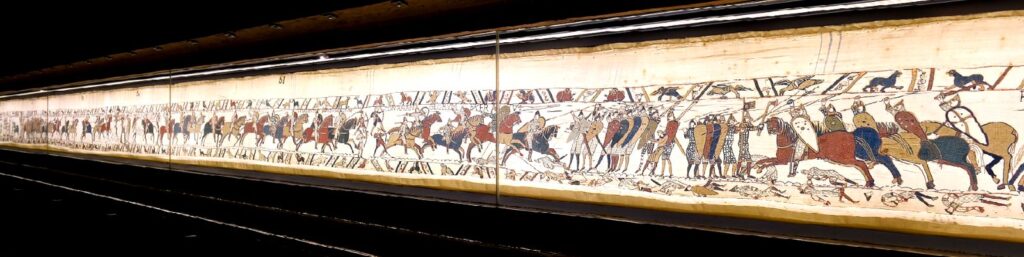 Tapiseria de la Bayeux, realizată în secolul al XI-lea, nu este o tapiserie țesută, ci o broderie elaborată pe pânză de in, care povestește, „prin imagini vii și inscripții latine”, cucerirea Angliei de către William Cuceritorul în 1066.
