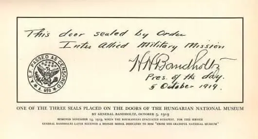 Generalul a preluat cheile muzeului, a sigilat ușile cu un aviz al Misiunii Interaliate („This door sealed by Order – Inter-Allied Military Commission. H.H. Bandholtz, President of the Day, October 5th, 1919.”) și a refuzat predarea cheilor, împiedicând astfel evacuarea bunurilor.