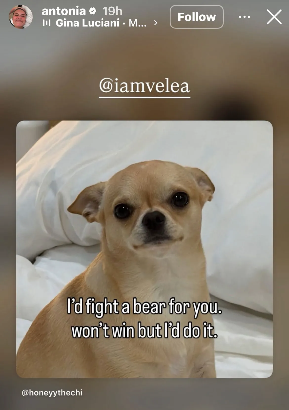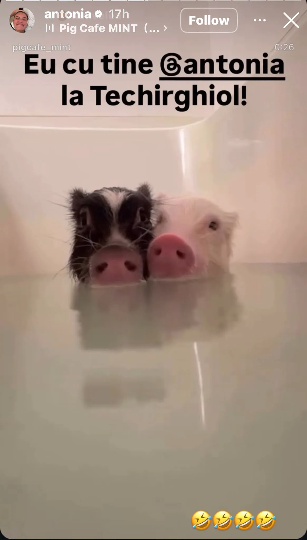 Într-o postare, Antonia a pus o poză cu un cățel chihuahua, alături de mesajul: „Aș lupta cu un urs pentru tine. Nu aș câștiga, dar aș face-o”. Alex Velea i-a dat imediat replica, postând doi purcei într-o cadă, alături de textul „eu cu tine la Techirghiol, Antonia”.