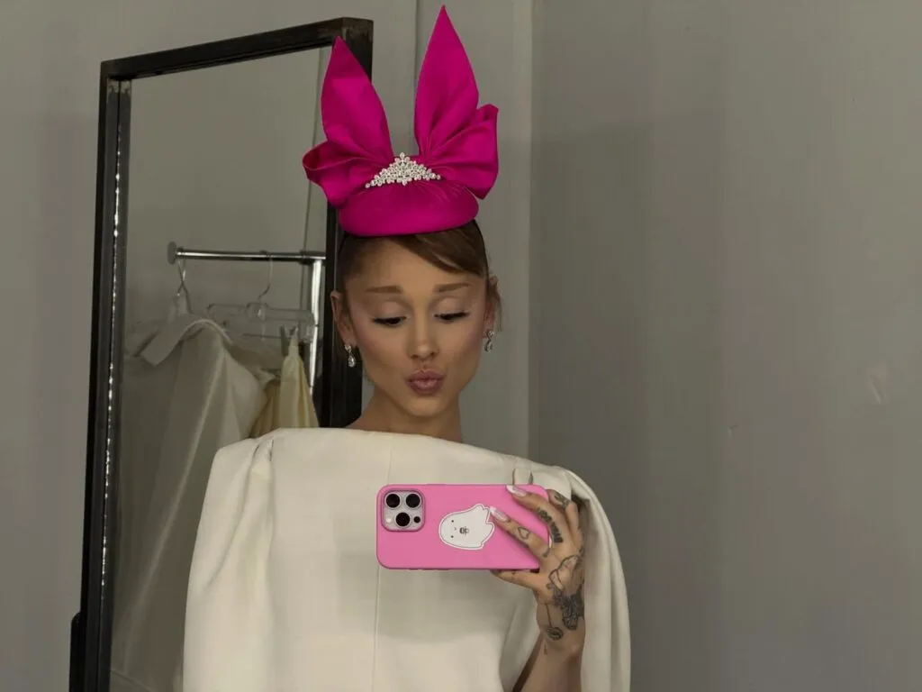 Ariana Grande purta o mănușă albă transparentă, iar câteva dintre tatuajele de pe mână erau, de asemenea, evidente în imagine.