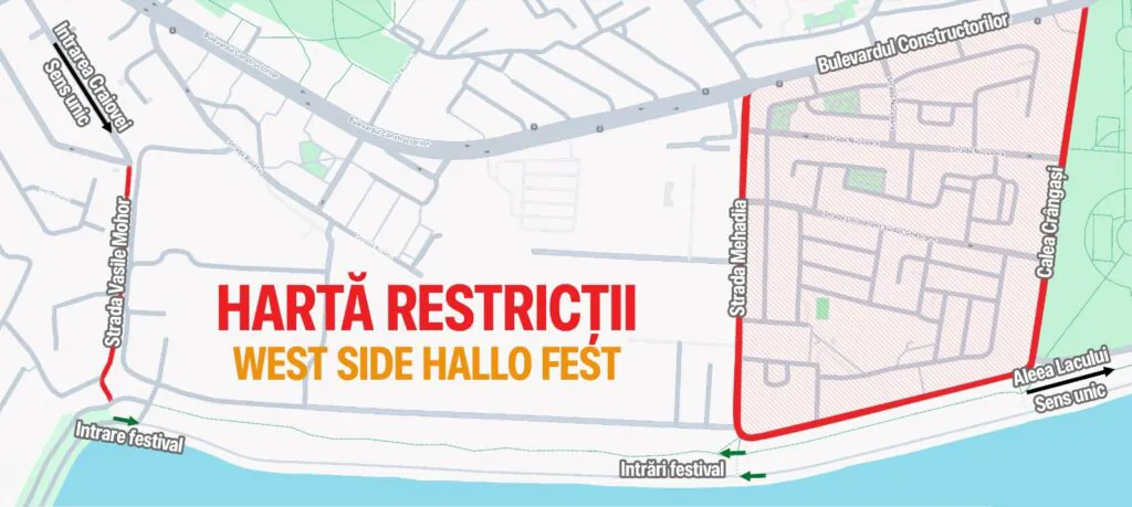 Traficul din zonă va fi restricționat de joi, ora 23.00, până luni, ora 06.00. Astfel, nu se va putea intra cu mașina în perimetrul Bd. Constructorilor – Calea Crângași – str. Mehadia (cu excepția riveranilor și a persoanelor cu dizabilități, pentru care există locuri de parcare) și pe Str. Vasile Mohor (cu excepția organizatorilor, artiștilor).