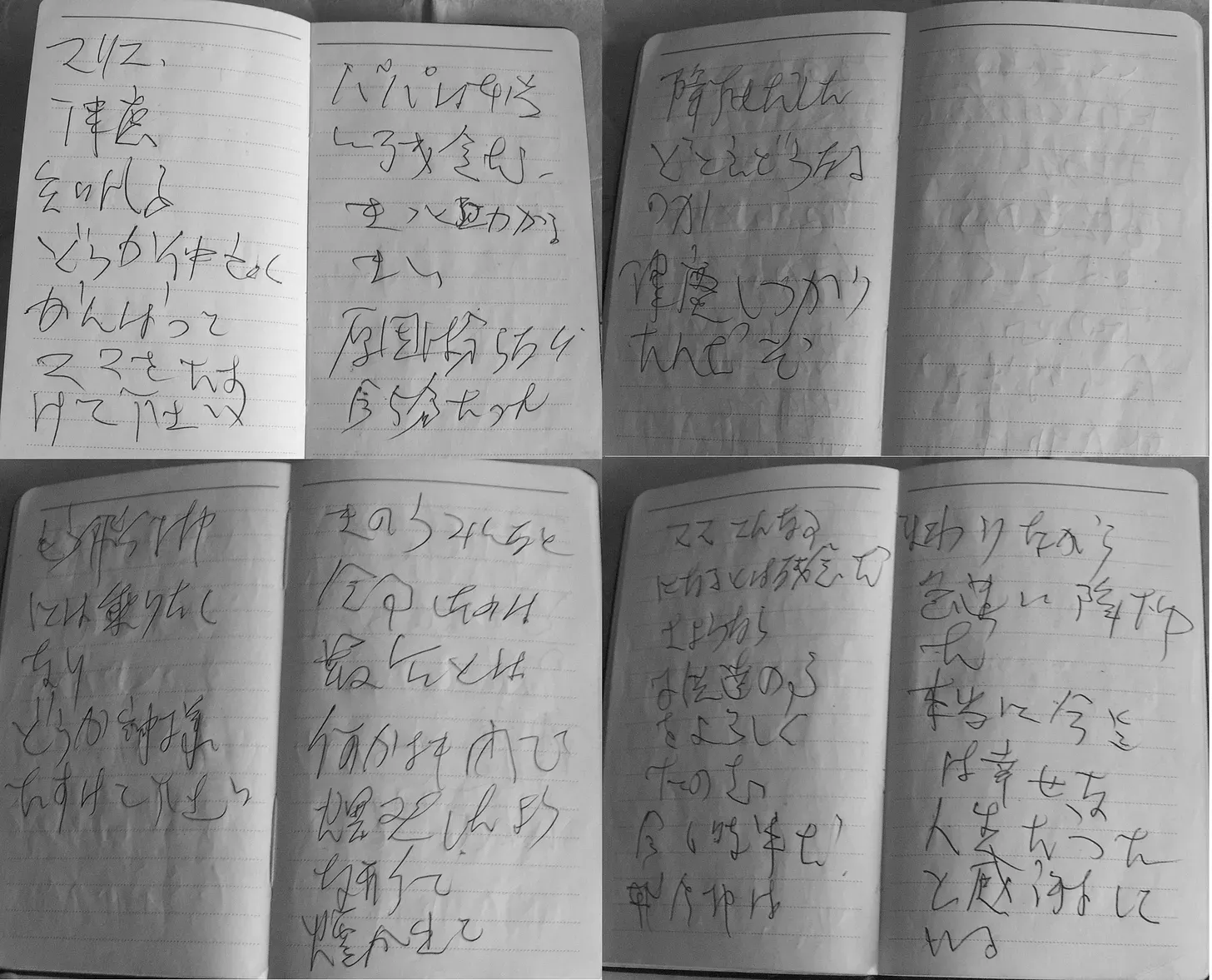 În contrast dureros, mesajul lăsat de Mariko Shirai este redus aproape exclusiv la panică pură: „Mi-e frică. Mi-e frică. Mi-e frică. Ajutați-mă. Nu vreau să mor”, în timp ce Kazuo Yoshimura lasă una dintre cele mai simple și grele fraze: „Vă rog să trăiți cu curaj. Aveți grijă de copii”.
