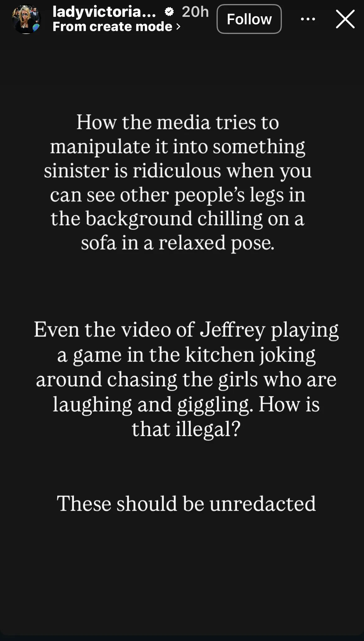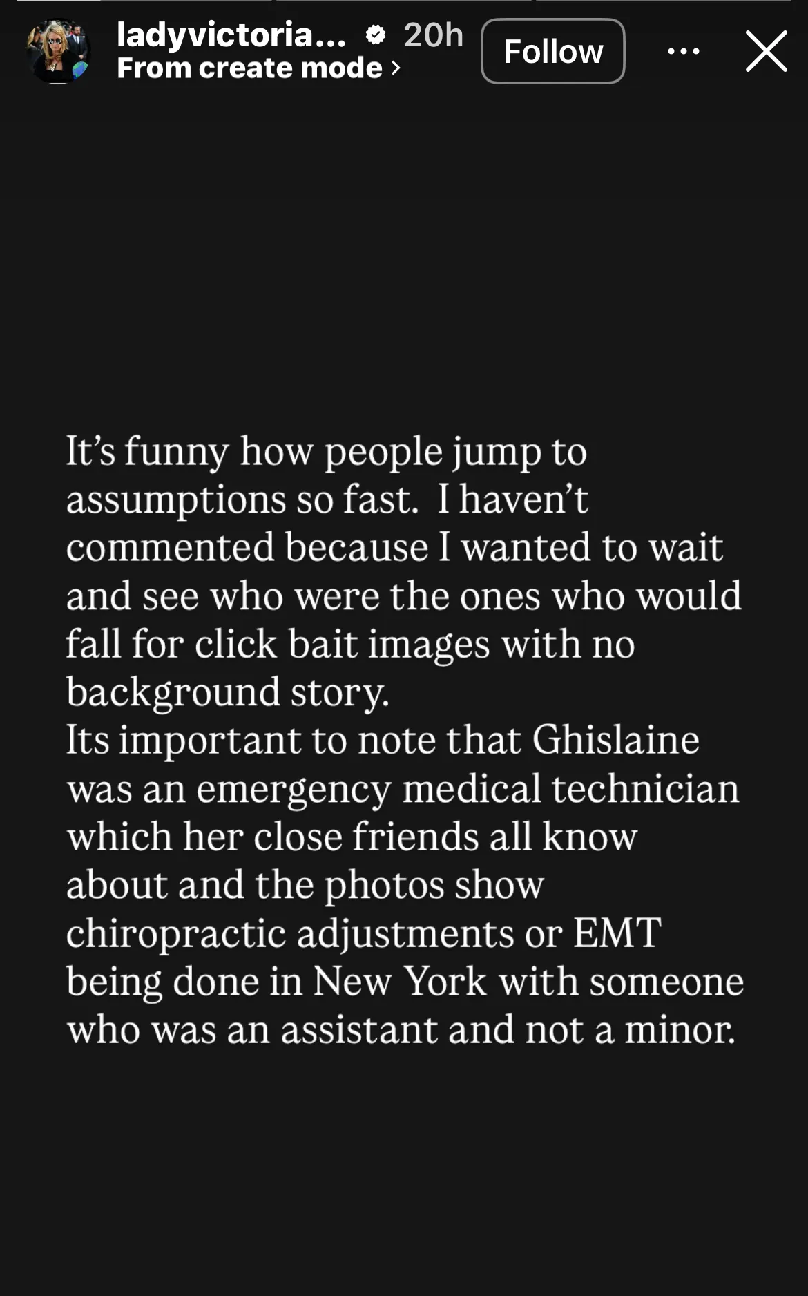 Mai departe, Lady Victoria Hervey a sugerat că unele imagini controversate cu Ghislaine Maxwell ar fi fost greșit interpretate, afirmând că aceasta ar fi avut pregătire de paramedic și că fotografiile ar surprinde, de fapt, „manevre medicale sau ajustări chiropractice” realizate asupra unei persoane adulte. De asemenea, ea a minimalizat un videoclip în care Epstein apare „glumind și alergând fete prin bucătărie”, întrebând retoric „cum este asta ilegal”, și a cerut ca materialele apărute în spațiul public să fie făcute publice fără cenzură, poziționându-se astfel explicit în apărarea lui Epstein și Maxwell, în ciuda faptului că anchetele și condamnările oficiale au stabilit existența unei rețele de trafic sexual de minori.
