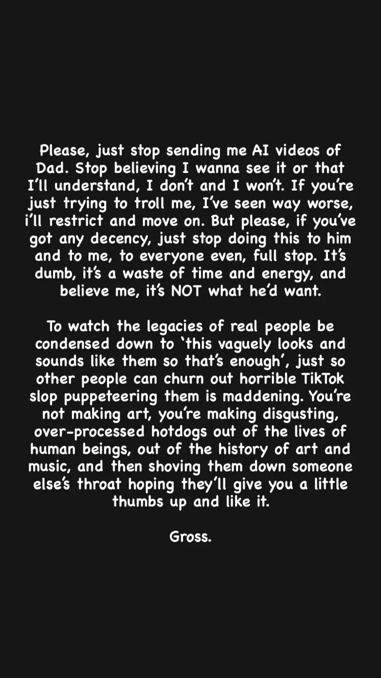 „Vă rog, opriți-vă din a-mi trimite videoclipuri AI cu tata. Nu mai credeți că vreau să le văd sau că le voi înțelege — nu vreau și nu le voi înțelege niciodată”, a scris ea în mediul online.
