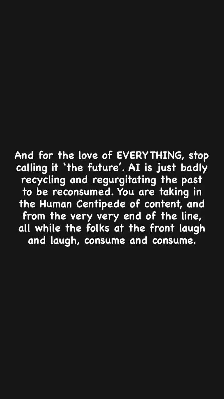 „Inteligența artificială doar reciclează prost și regurgitează trecutul pentru a fi reconsumat. Consumați Centipedul Uman al conținutului, și o faceți din capătul cel mai îndepărtat, în timp ce cei din față râd și râd, consumând la nesfârșit”, a scris ea.