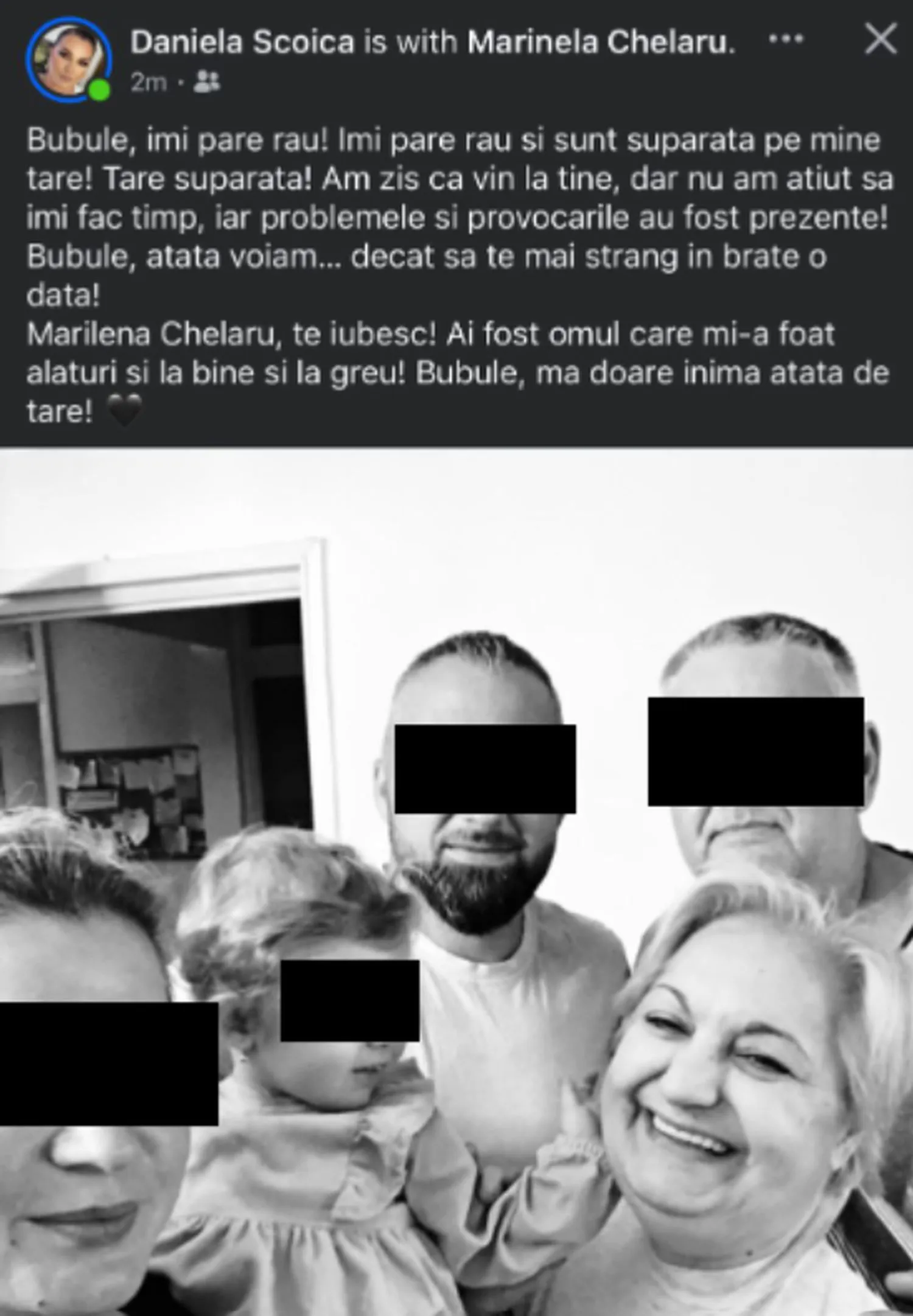 Marinela Chelaru, te iubesc! Ai fost omul care mi-a fost alături și la bine și la greu! Bubule, mă doare inima atât de tare!”, se arată în mesajul transmis de apropiata Marinelei Chelaru, pe Facebook.