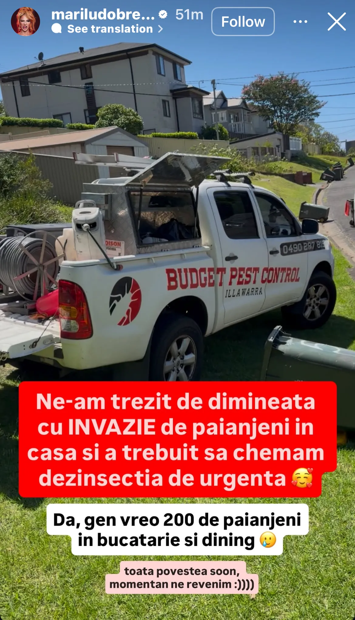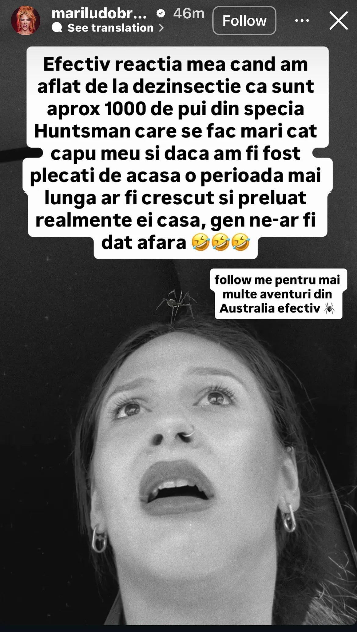 Însă adevărata lovitură a venit abia după intervenția specialiștilor. Marilu a aflat că situația era mult mai gravă decât părea la prima vedere. „Efectiv reacția mea când am aflat de la dezinsecție că sunt aproximativ 1000 de pui din specia Huntsman, care se fac mari cât capul meu și dacă am fi fost plecați de acasă o perioadă mai lungă ar fi crescut și ar fi preluat realmente ei casa, gen ne-ar fi dat afară”, a mai spus influencerița, încercând să trateze situația cu umor.