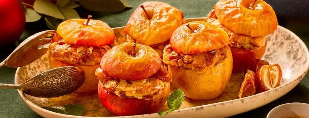 Un desert elegant pentru masa de Bobotează: mere coapte cu marțipan și curmale. Rețeta e un deliciu